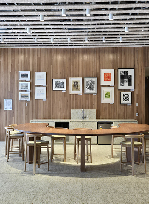 With wood panelled walls, a high ceiling and excellent lighting, upon entering visitors to the library and business hub can expect to be greeted by a dynamic display of original prints.