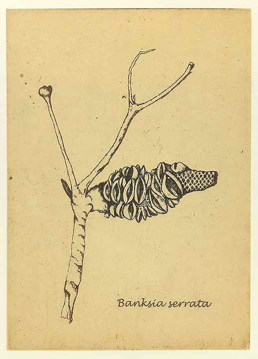 Bottom Left: Banksia serrata, etching. Right: Shards, jigsaw collagraphs.