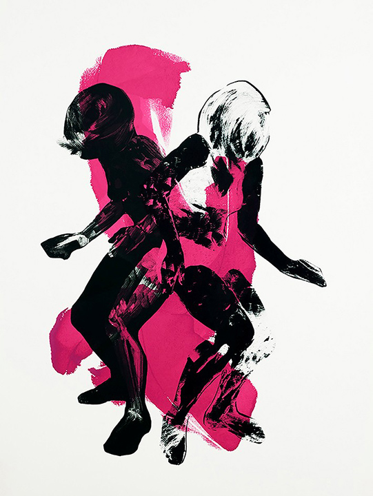 When working in the print studio informal conversations frequently occur due to the sharing of equipment and space. These exchanges can enhance the quality of work as well as offer a sense of artistic collegiality in a sometimes-disconnected world. Also, the weight of the press embeds imagery into paper through contact, which relates to Elizabeth’s experience of dance. Shared movement whether in couples or groups is weighted and subject to the laws of gravity, providing opportunities for different ways of knowing others.