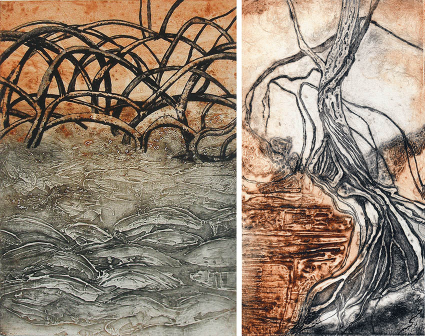 The tonal effects of light playing on surfaces is another source of pattern and shape I like to explore. My recent work incorporates solar plate etchings, collagraphs and dry-point etchings and I often combine these different techniques to create the final print.