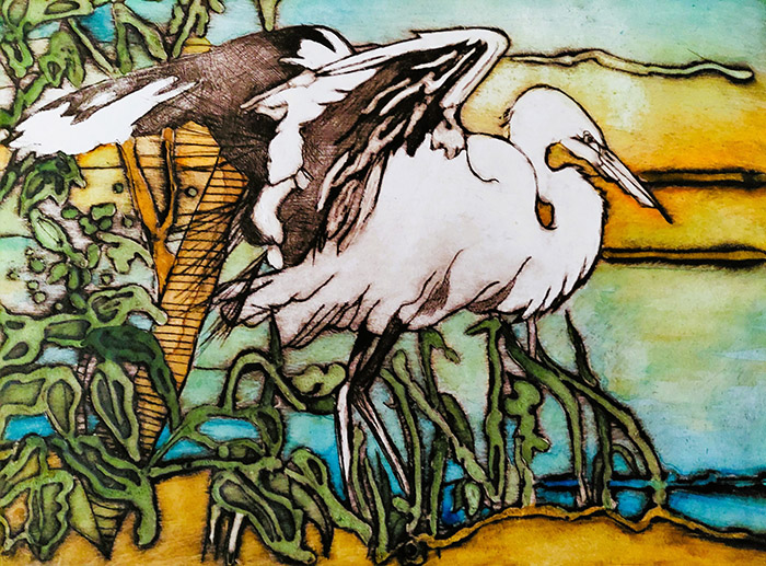 Top left: Egret, hand coloured collagraph. Top right: Hello Yellow, drypoint with rollover.